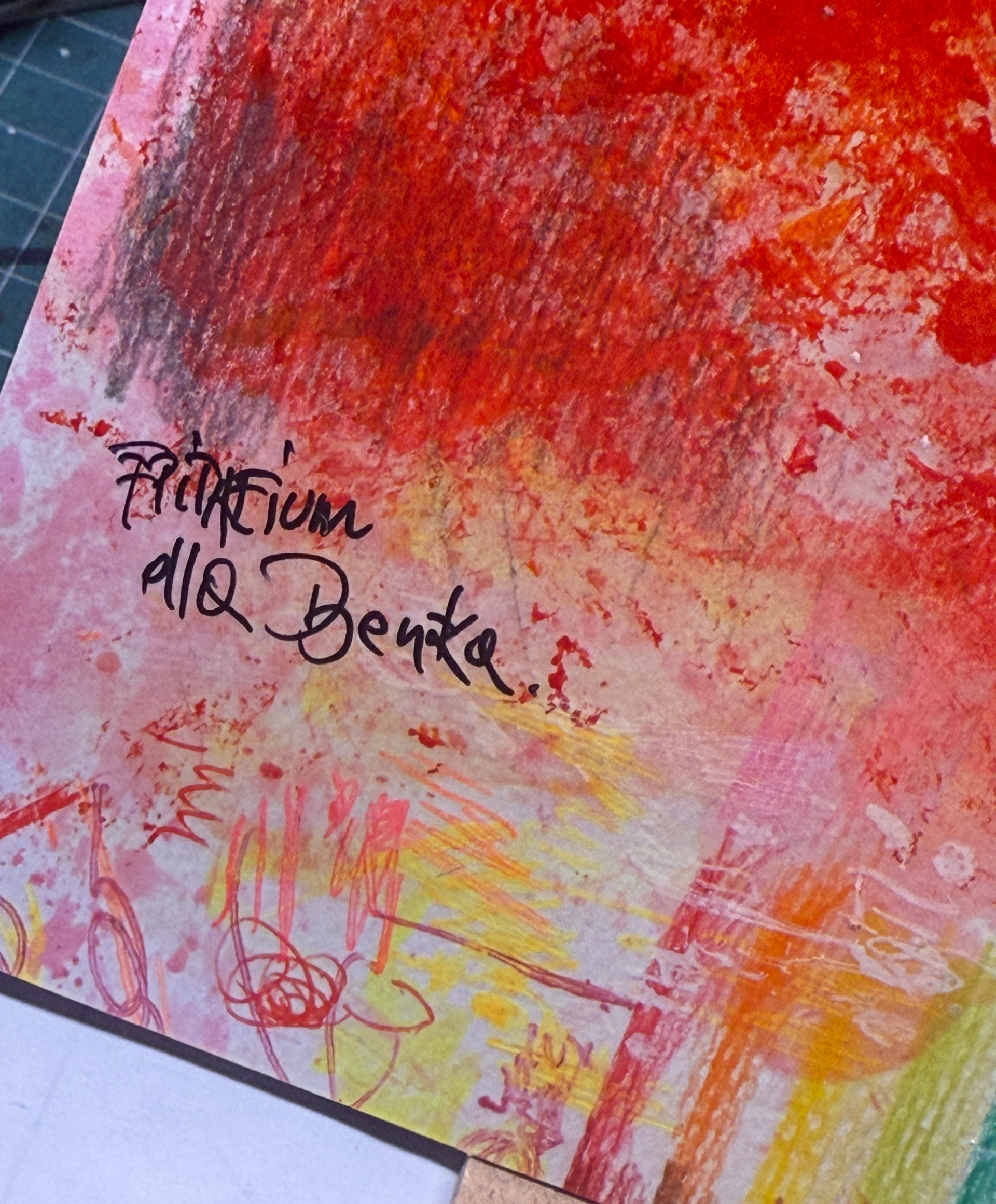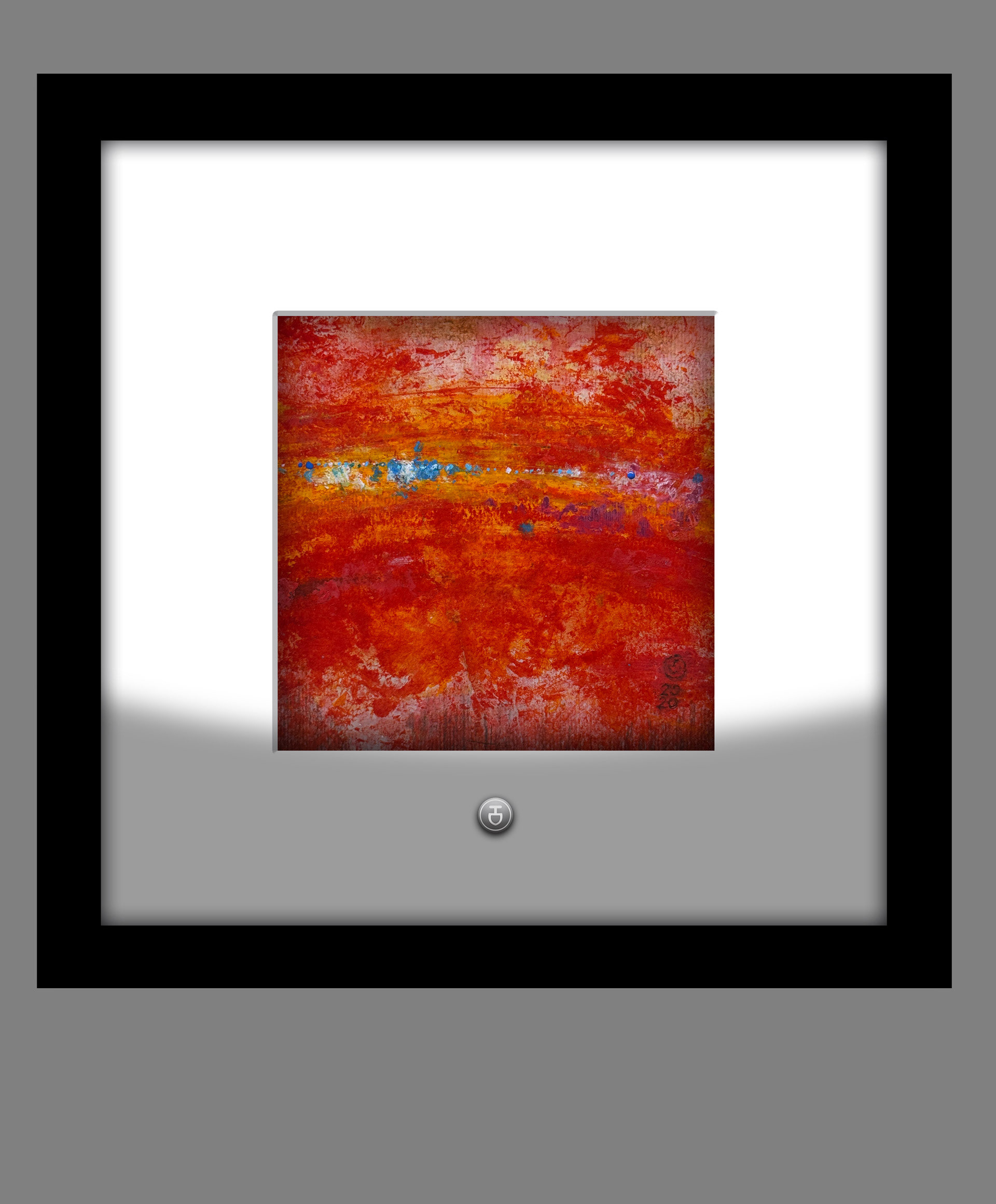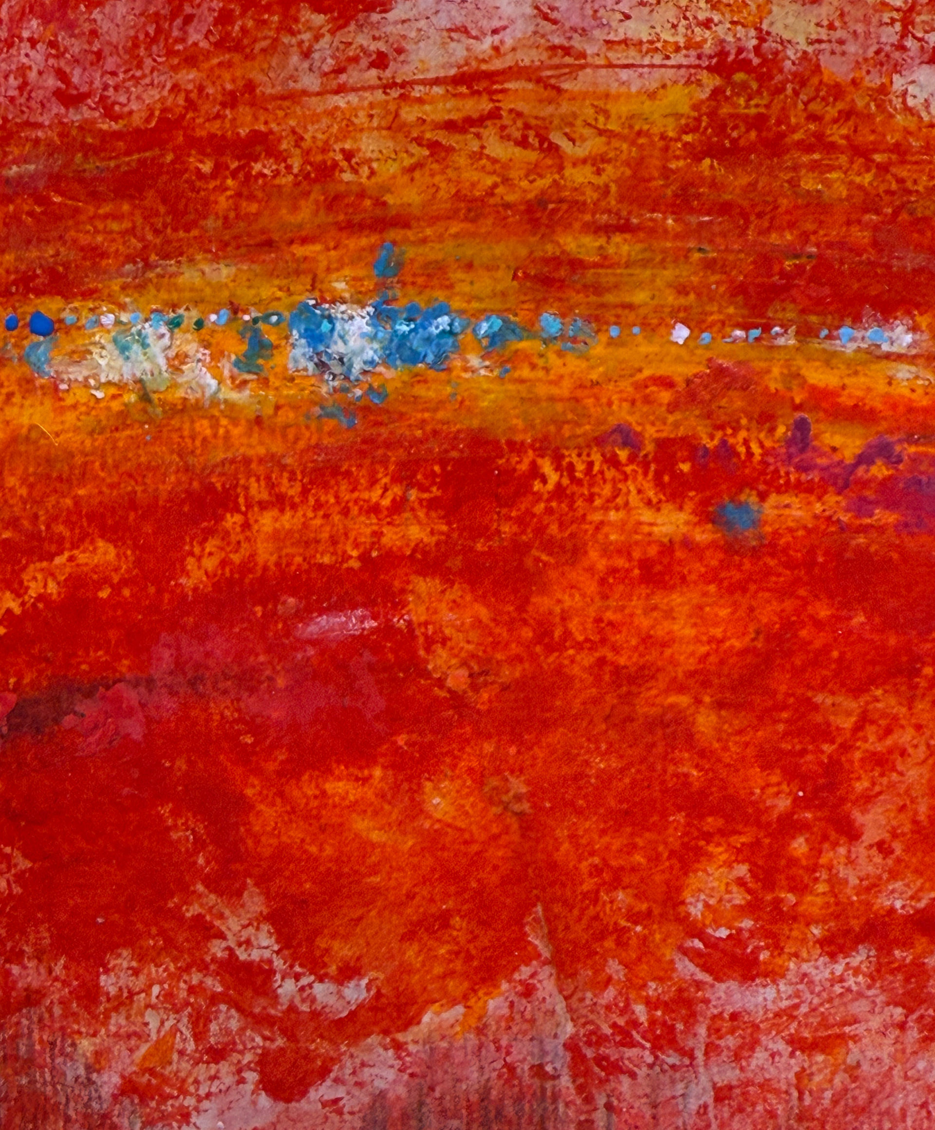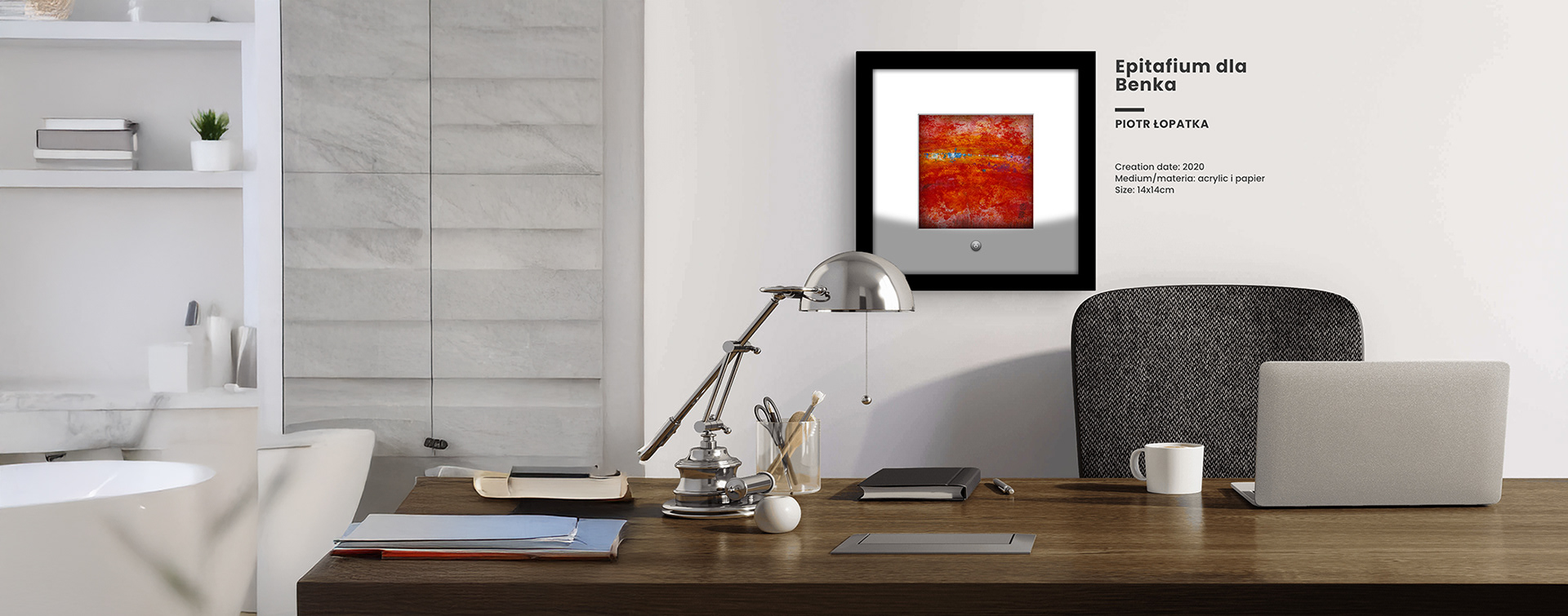 Abstrakcyjna kompozycja wykonana farbami akrylowymi na papierze, format 14×14 cm. Intensywne czerwienie i pomarańcze kontrastują z pasem błękitów, tworząc dynamiczny, pełen energii obraz o silnym ładunku emocjonalnym. Ilustracja dedykowana jest pamięci przyjaciela jako osobiste epitafium.