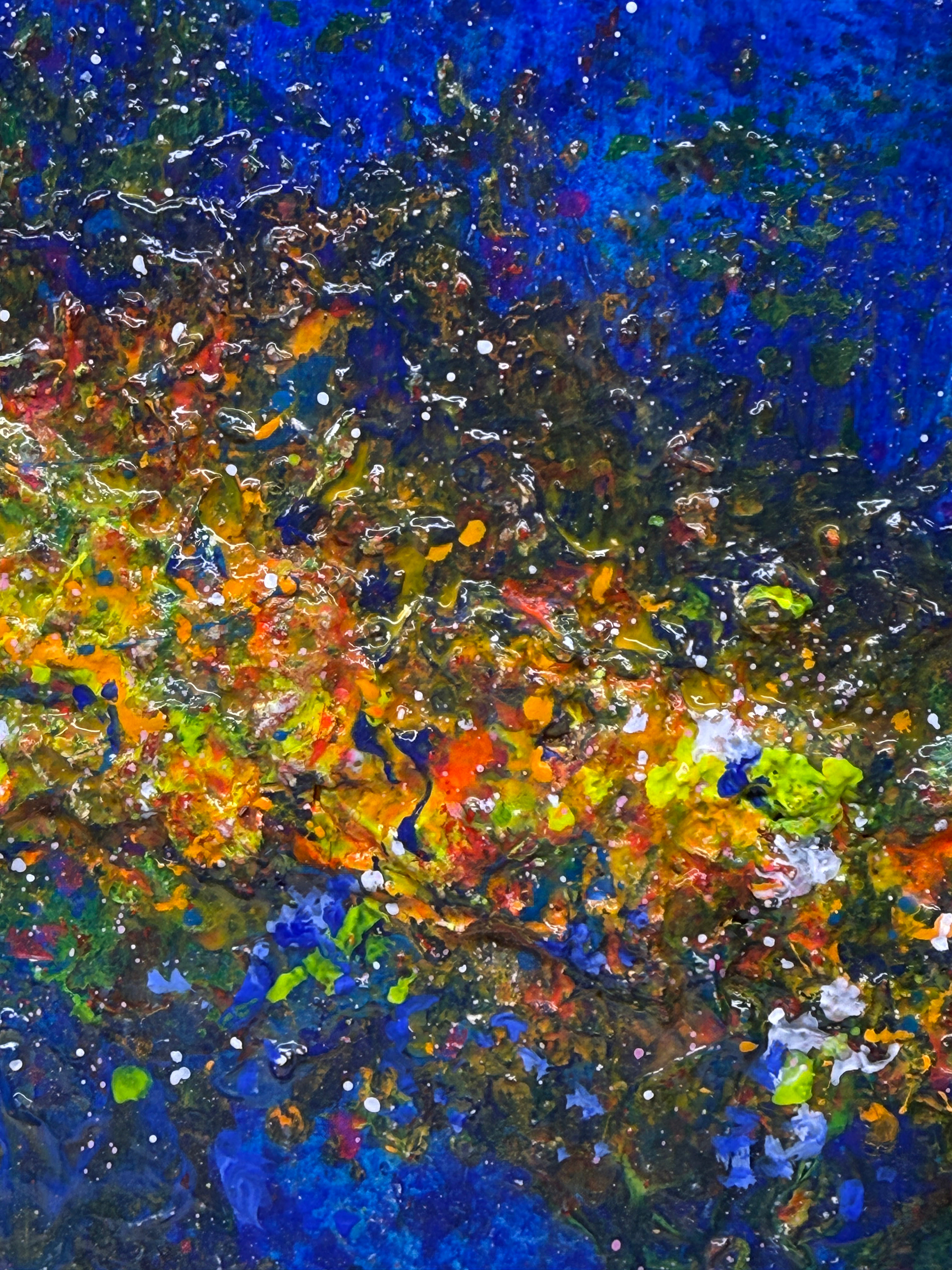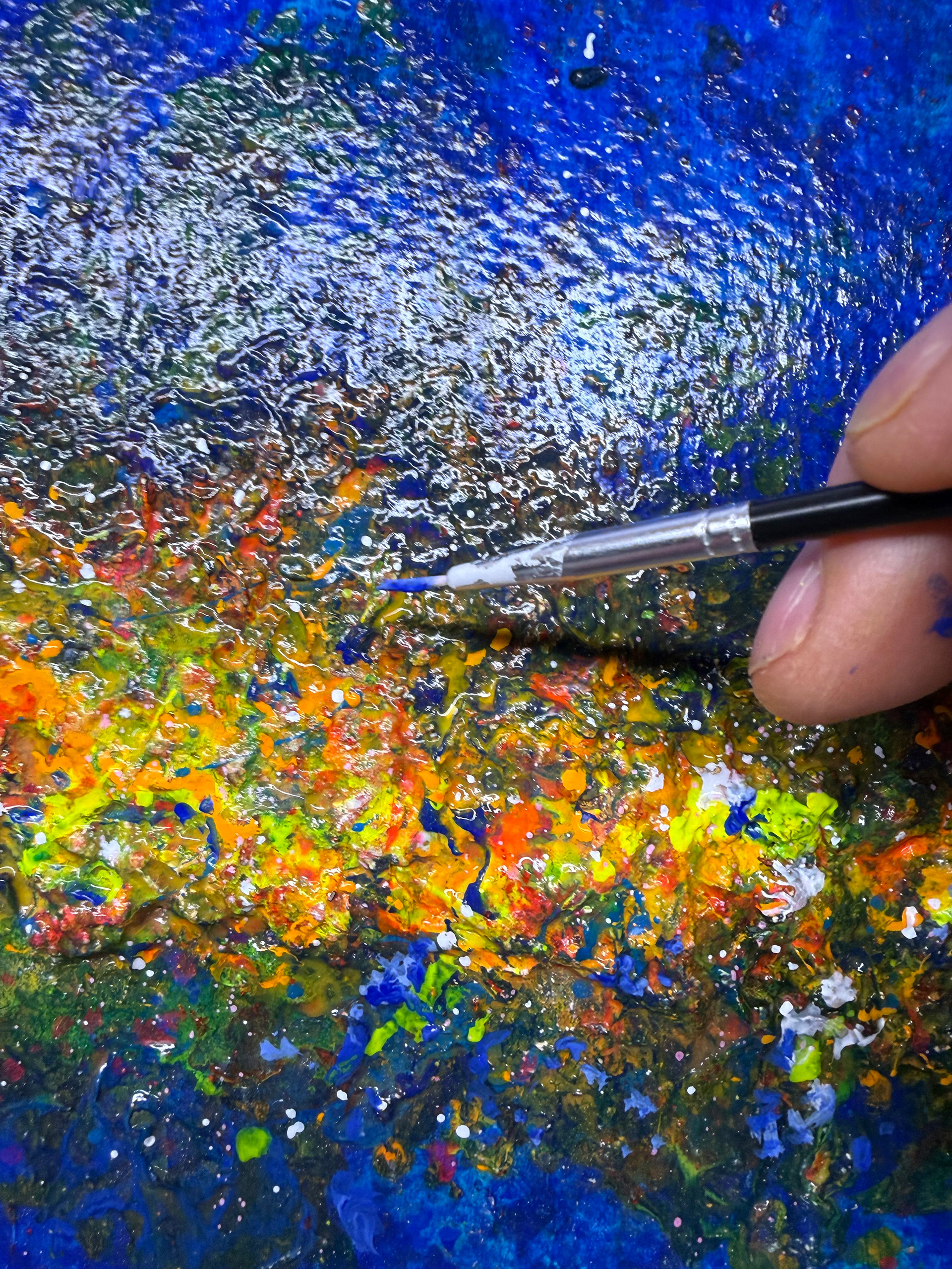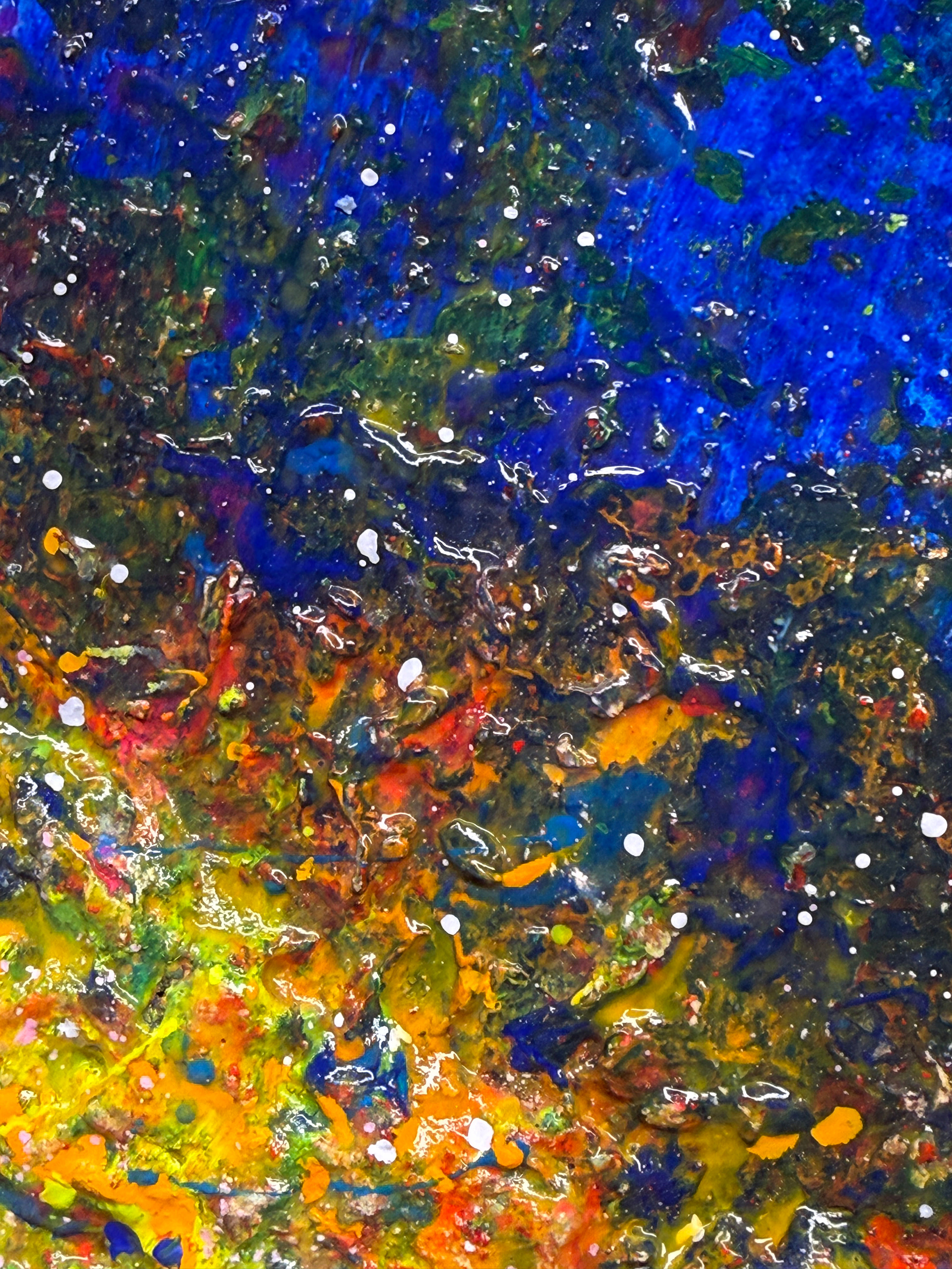 Tytuł/Title: IN PROGRESS #4Ekspresyjna abstrakcja utrzymana w głębokich odcieniach błękitu, przecięta świetlistym pasmem intensywnych barw, przywodzącym na myśl kosmiczny horyzont lub strumień energii. Bogata faktura i dynamiczny gest nadają dziełu poczucie ruchu oraz głębi, zapraszając widza do własnej interpretacji. Obraz stanowi wyrazisty, nowoczesny akcent, który ożywi każdą przestrzeń i nada jej unikalny charakter.