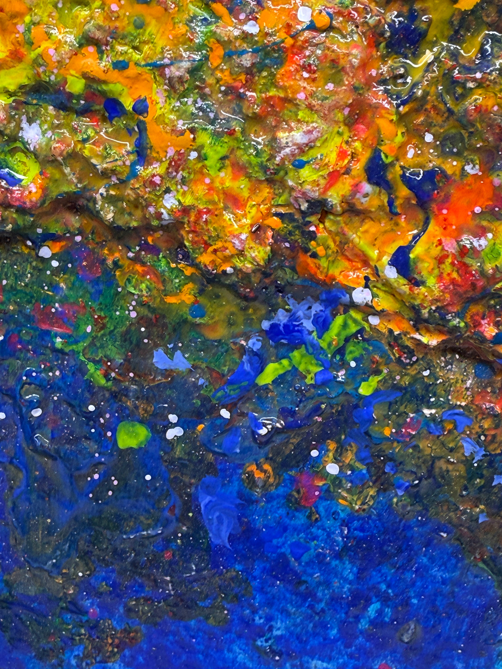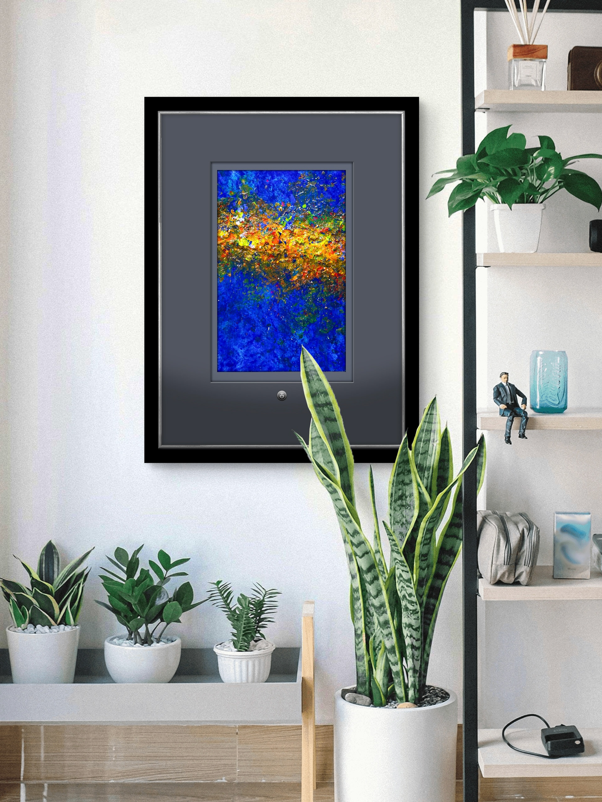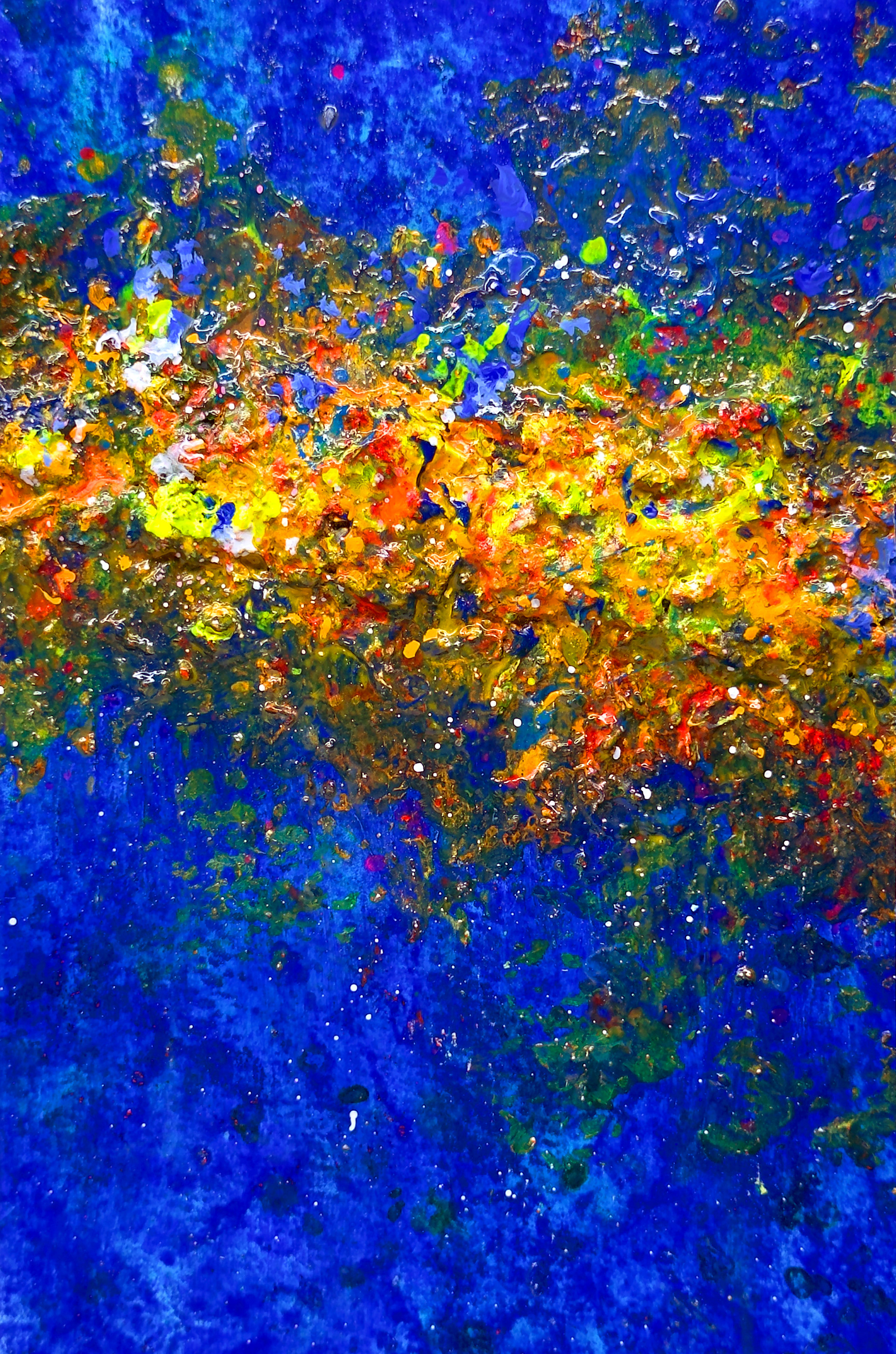 An expressive abstract composition dominated by deep shades of blue, intersected by a luminous band of intense colors that evokes a cosmic horizon or a stream of energy. The rich texture and dynamic gesture create a sense of movement and depth, inviting personal interpretation. The artwork serves as a striking contemporary accent that enlivens any space and gives it a distinctive character.