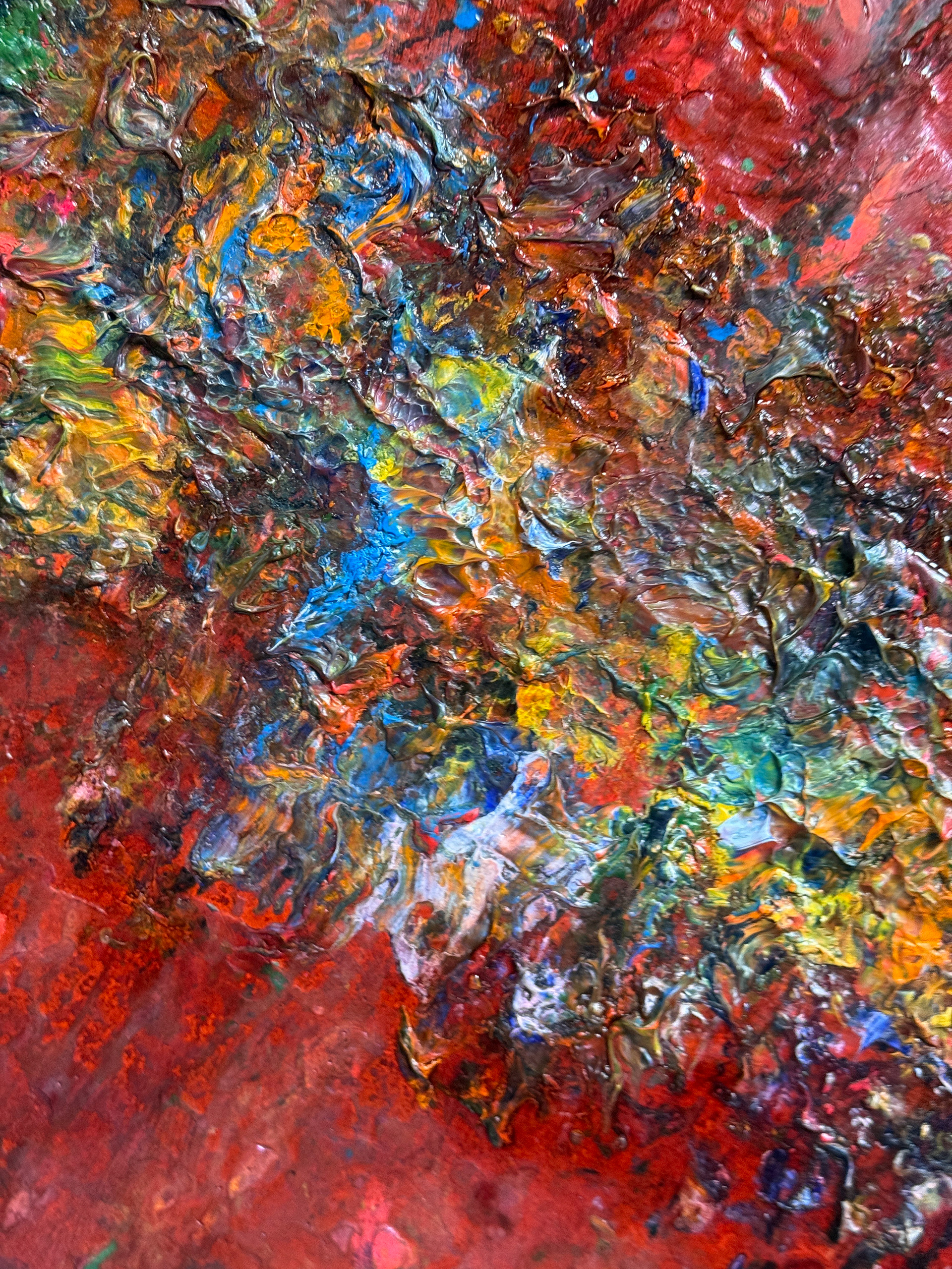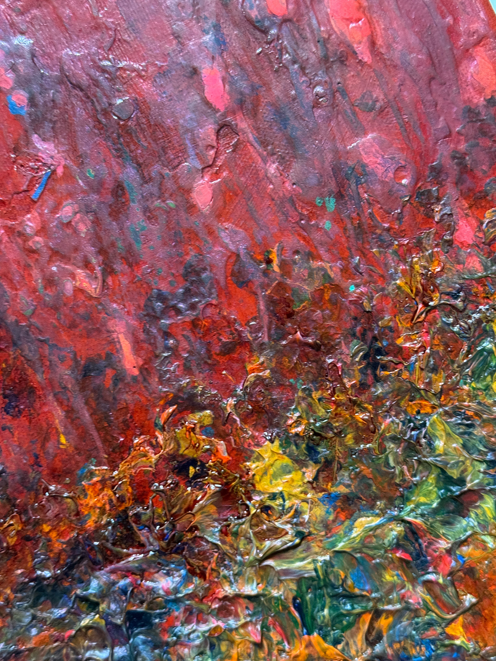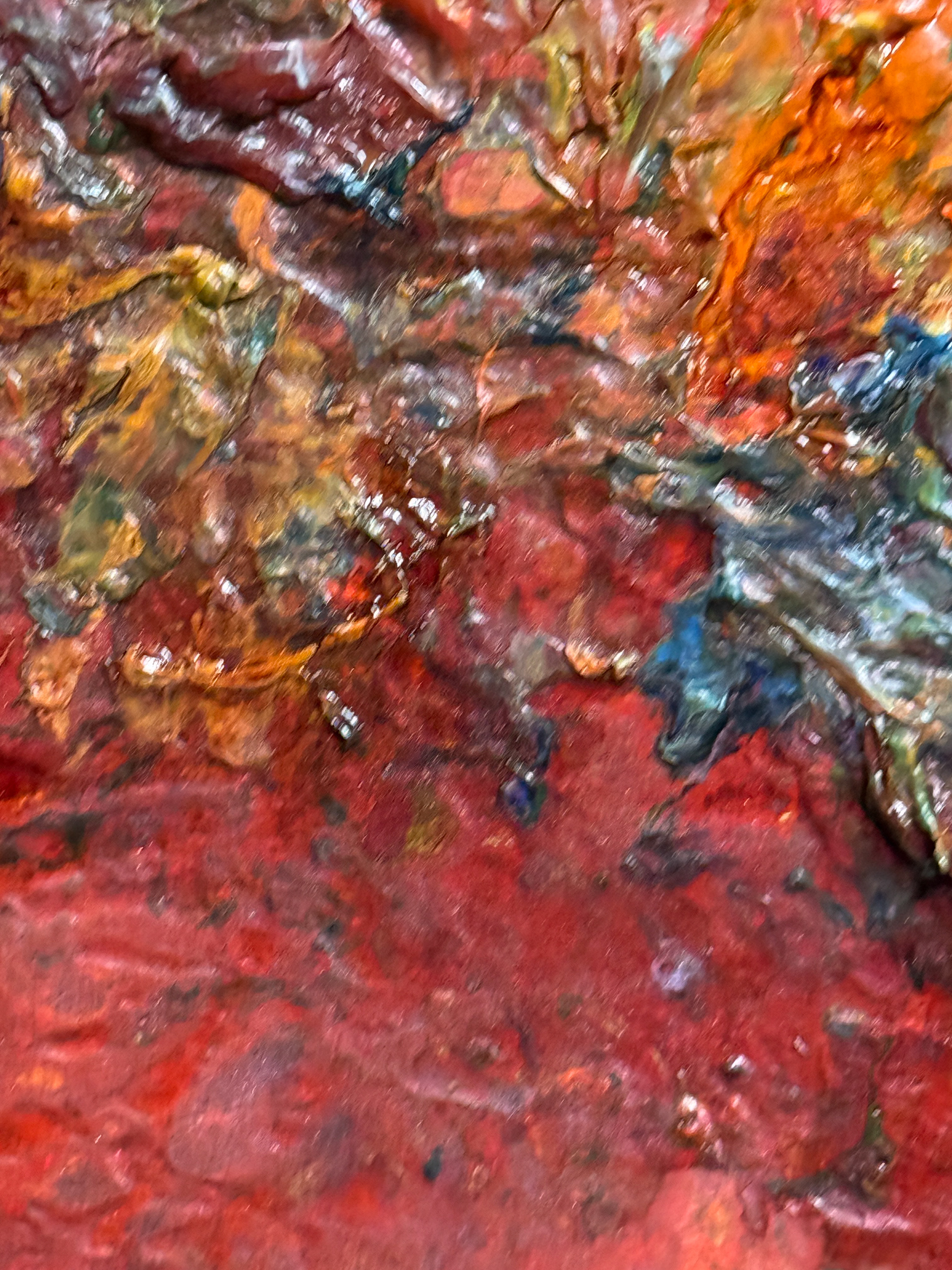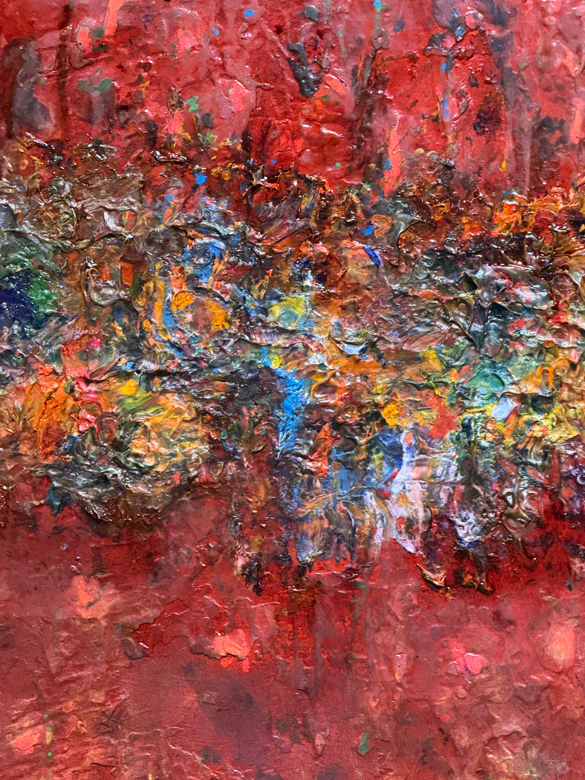 This expressive abstract composition is dominated by a deep range of reds interwoven with rich textures and subtle color transitions. The central horizontal band of vivid hues — from yellows and oranges to blues and violets — creates dynamic tension and visual depth. The impasto technique, with thick layers of paint, conveys a sense of movement and raw energy, as if the artist’s emotions were captured in the very substance of color.