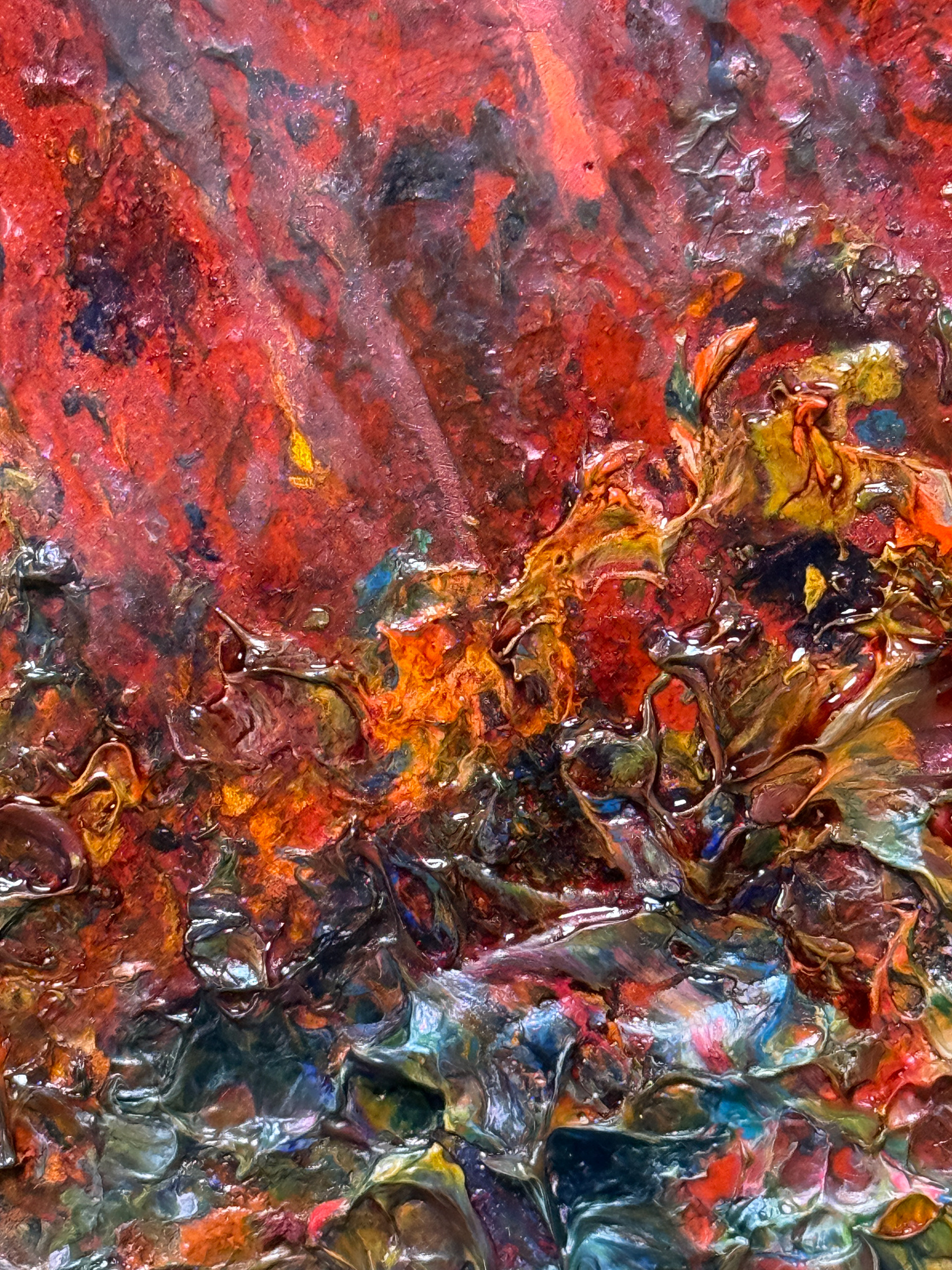Kompozycja przywodzi na myśl pejzaż emocjonalny lub symboliczny horyzont, w którym kontrast między nasyconą czerwienią a chłodnymi refleksami błękitu podkreśla dramatyzm i wewnętrzne pulsowanie życia. Obraz ma charakter niemal muzyczny — rytmiczny, gęsty, a zarazem pełen subtelnych przejść tonacyjnych.