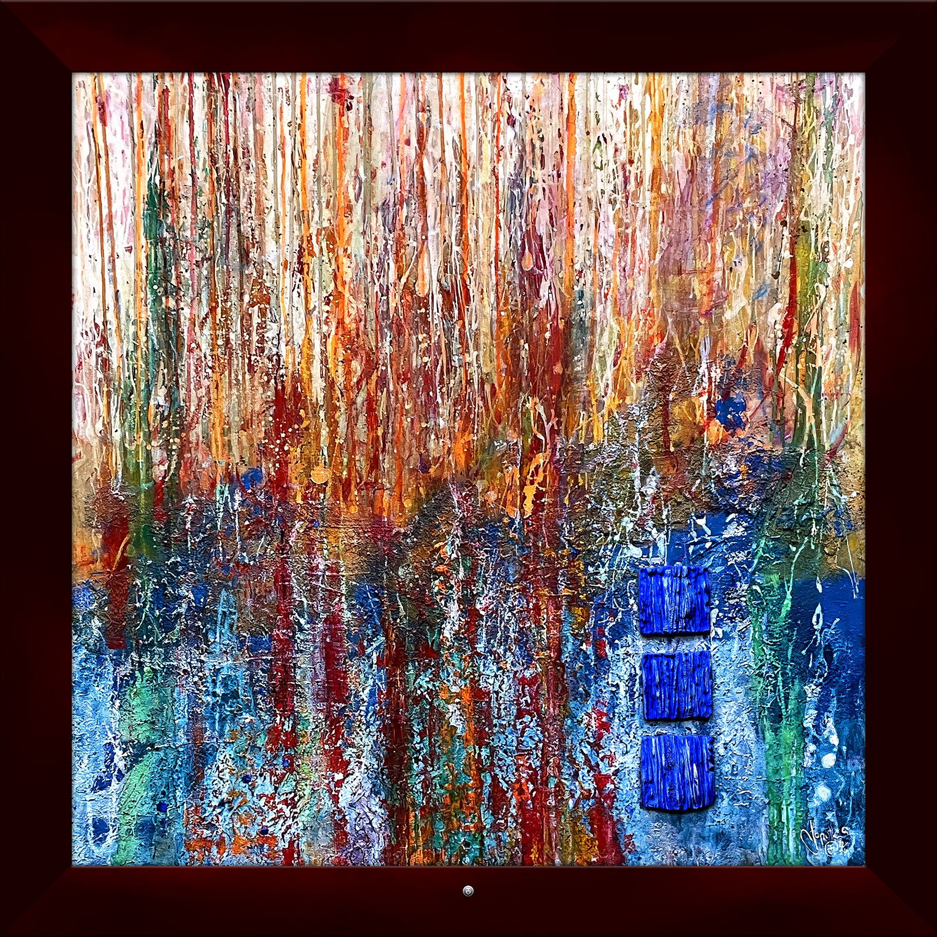 A dynamic abstract composition where colorful streams and splashes of paint intertwine, evoking the impression of a vibrant, almost living landscape. The lower part of the canvas, dominated by cool blues and greens, contrasts with the upper section glowing with warm tones of red, orange, and gold. Three geometric terracotta elements stand out within the composition, adding depth, texture, and a sculptural dimension to the work.