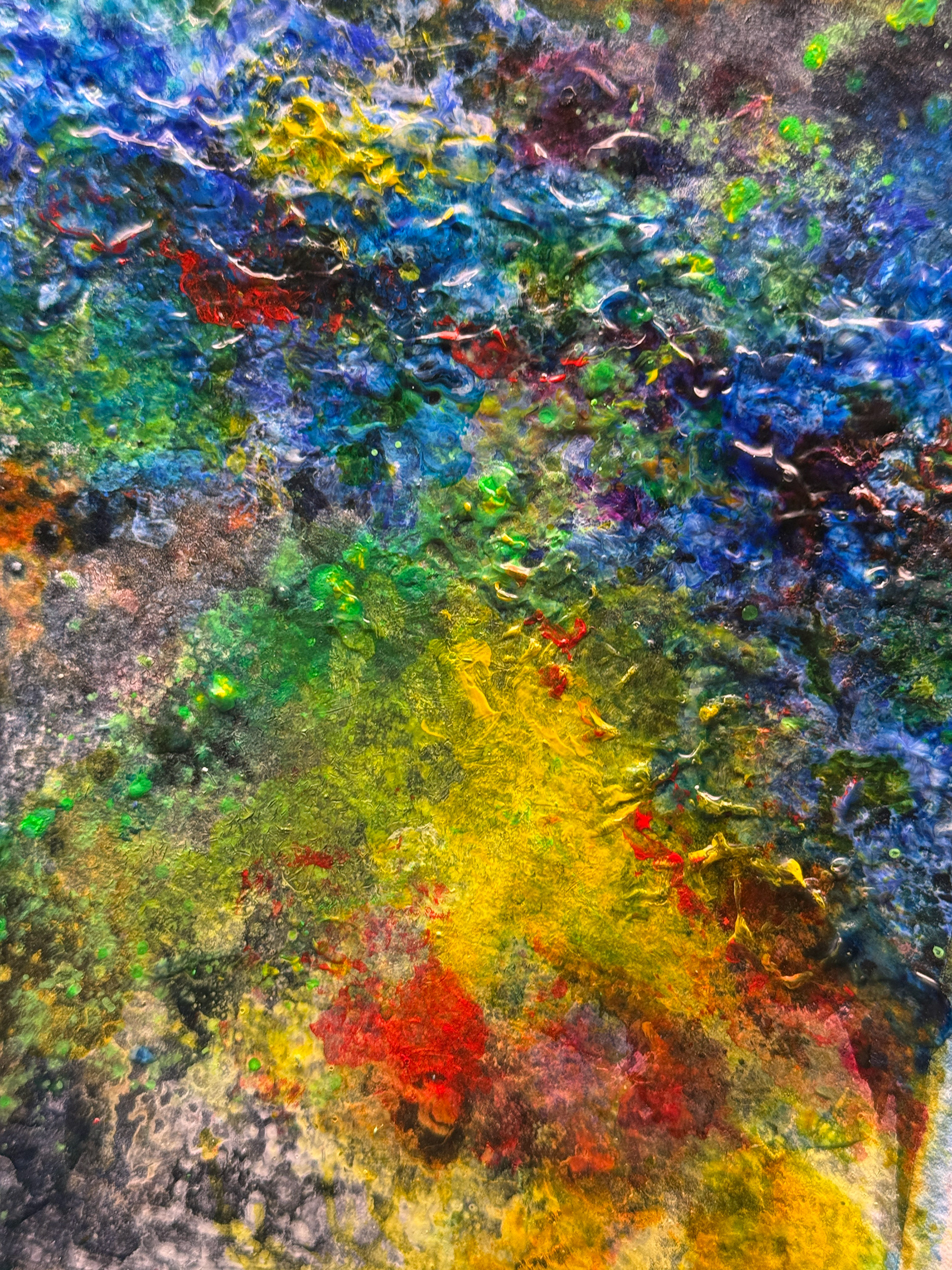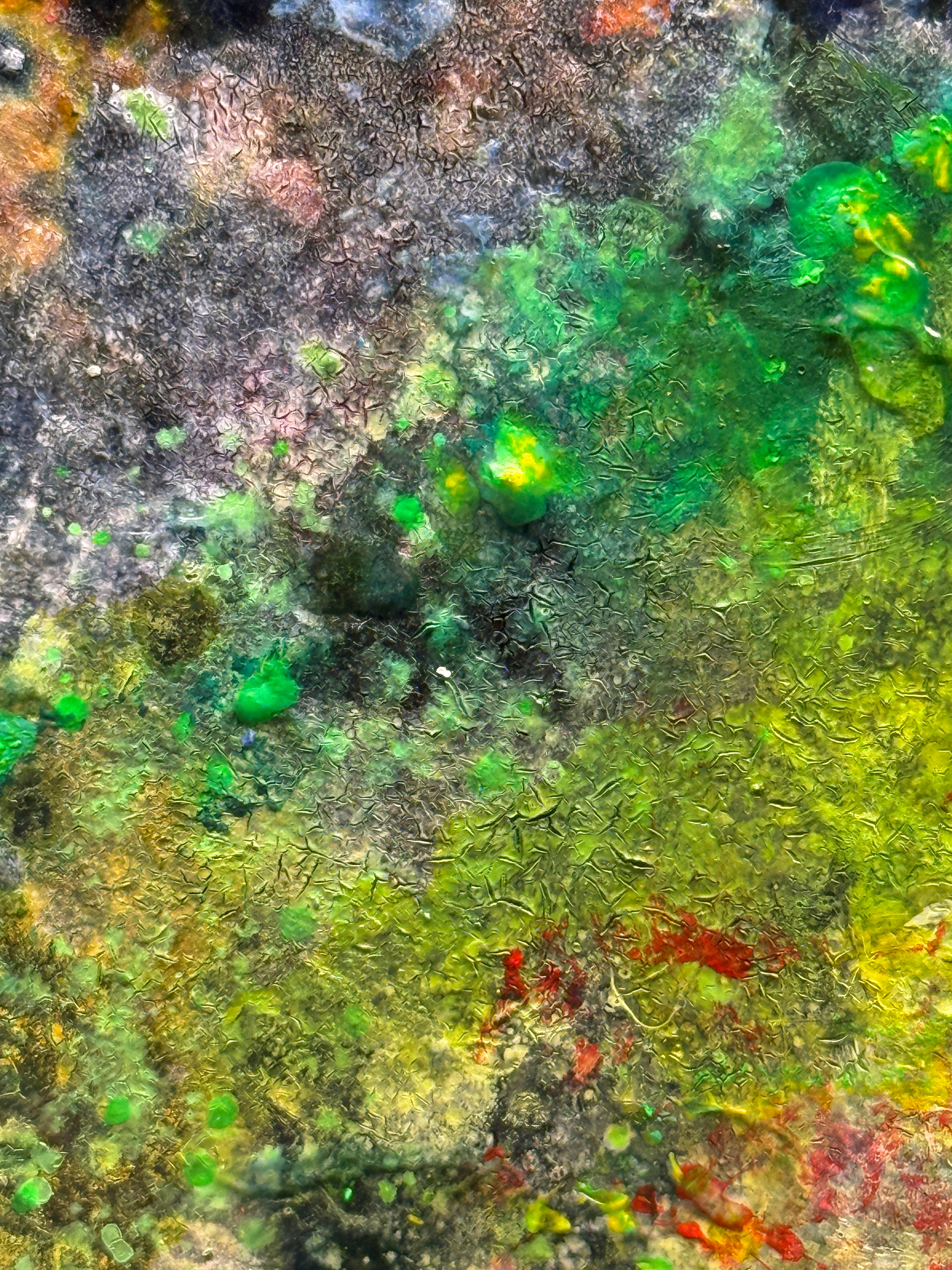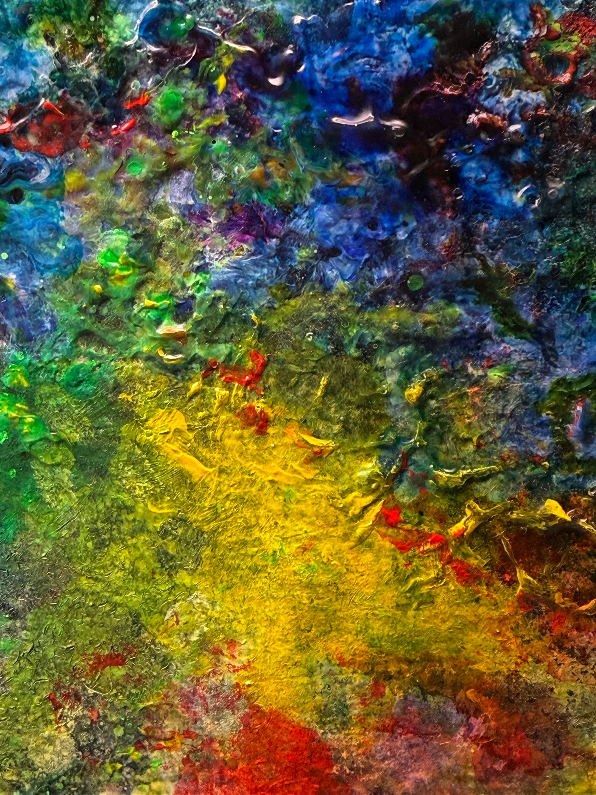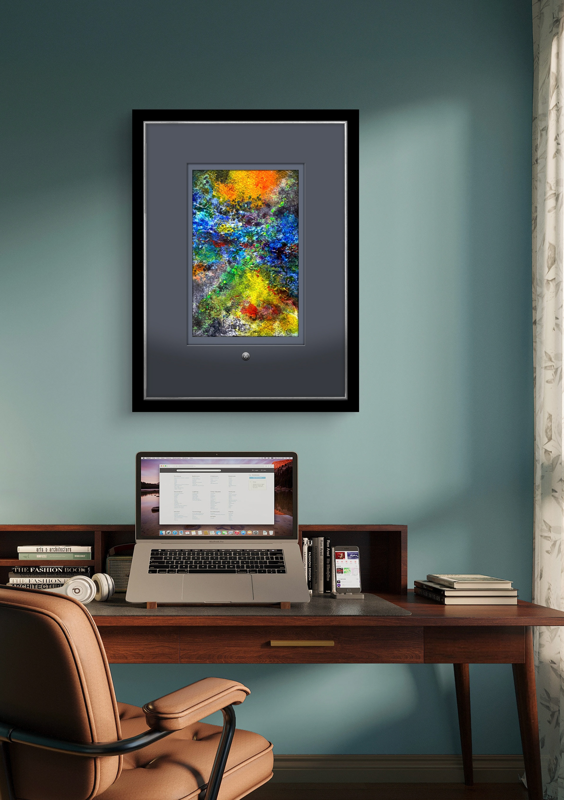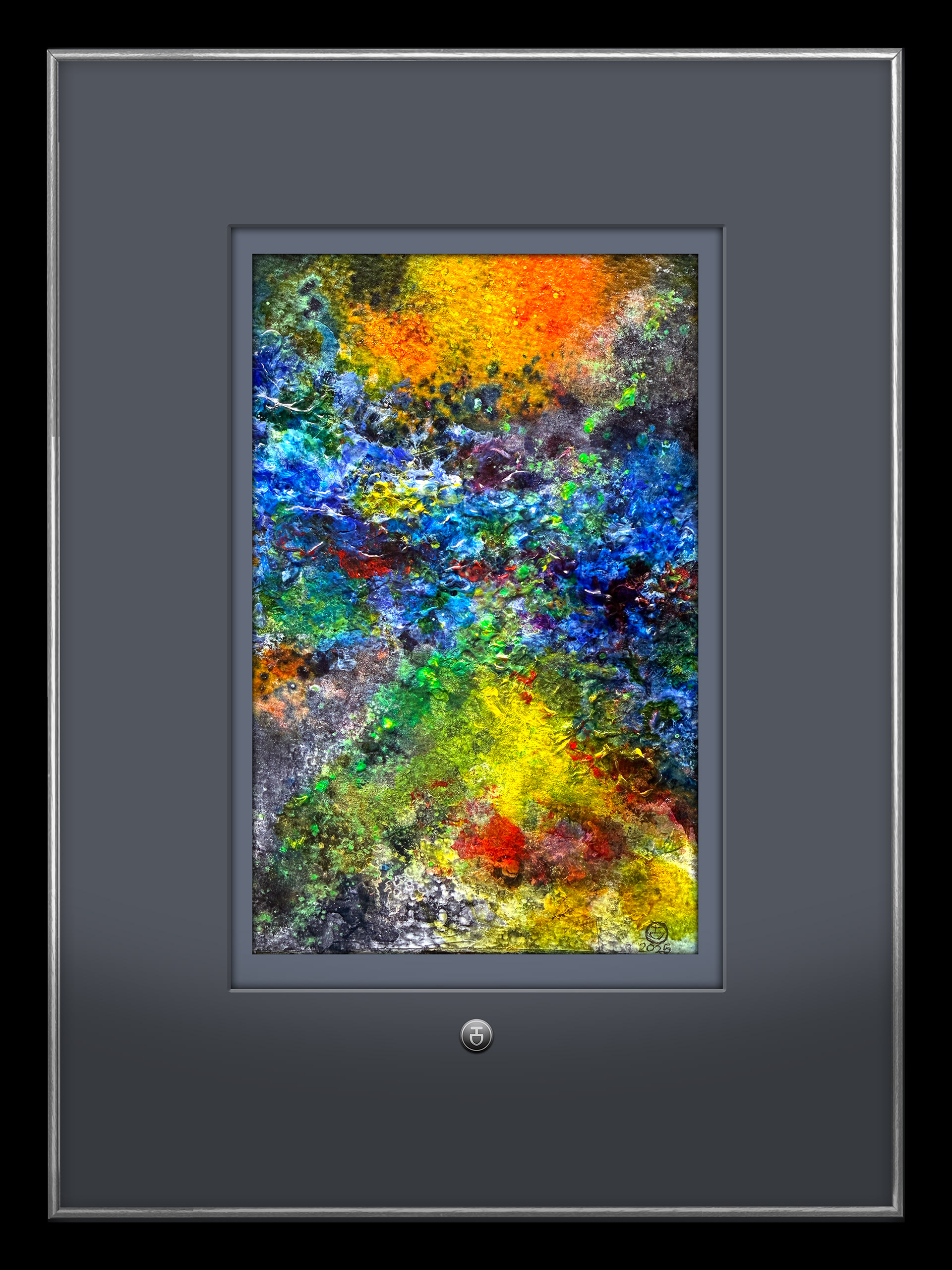 The painting radiates energy, as if captured in the instant of an internal, explosive creative impulse. The intense palette — from incandescent oranges and yellows to deep cobalt, violets, and greens — builds a visual drama that refuses to let the eye settle into calm. Every section of the canvas seems to vibrate with its own rhythm, as though color here is not merely a formal device but a living substance. The chromatic structure forms an organic, almost tectonic zone of tension. A central band of cool tones cuts through the composition like a vein of energy, stabilizing the emotional excess of the surrounding warm colors. As a result, the work organizes itself not around classical harmony, but around the dialectic of opposites — heat and cold, light and depth, impulse and control. The texture, suggesting dense, layered application of paint, plays a role equal to that of color: this is not a surface but a landscape. Subtle thickenings, roughness, and alternating areas of smoothness reveal themselves only through prolonged, attentive viewing. Only then does one perceive the rhythm of the artist’s hand beneath the surface — a gesture spontaneous but not chaotic. What is most intriguing about this composition is its ambiguity. The painting avoids literal interpretation while opening a wide field of associations: it may be a vision of raw elements, a chromatic eruption, a fragment of nature seen up close, or a purely emotional record of an inner state. It is a work that deliberately resists description, yet remains saturated with experience — as if it were an echo of something intense that cannot be contained in shape, and must therefore be expressed in color. This is a painting that is not simply viewed but experienced: pulsating, sensual, immersed in gesture and pigment, inviting contemplation of one’s own reactions. Its strength lies precisely in this — in its courage to exist as pure, unrestrained expression which, despite its seeming disorder, forms a coherent and compelling whole