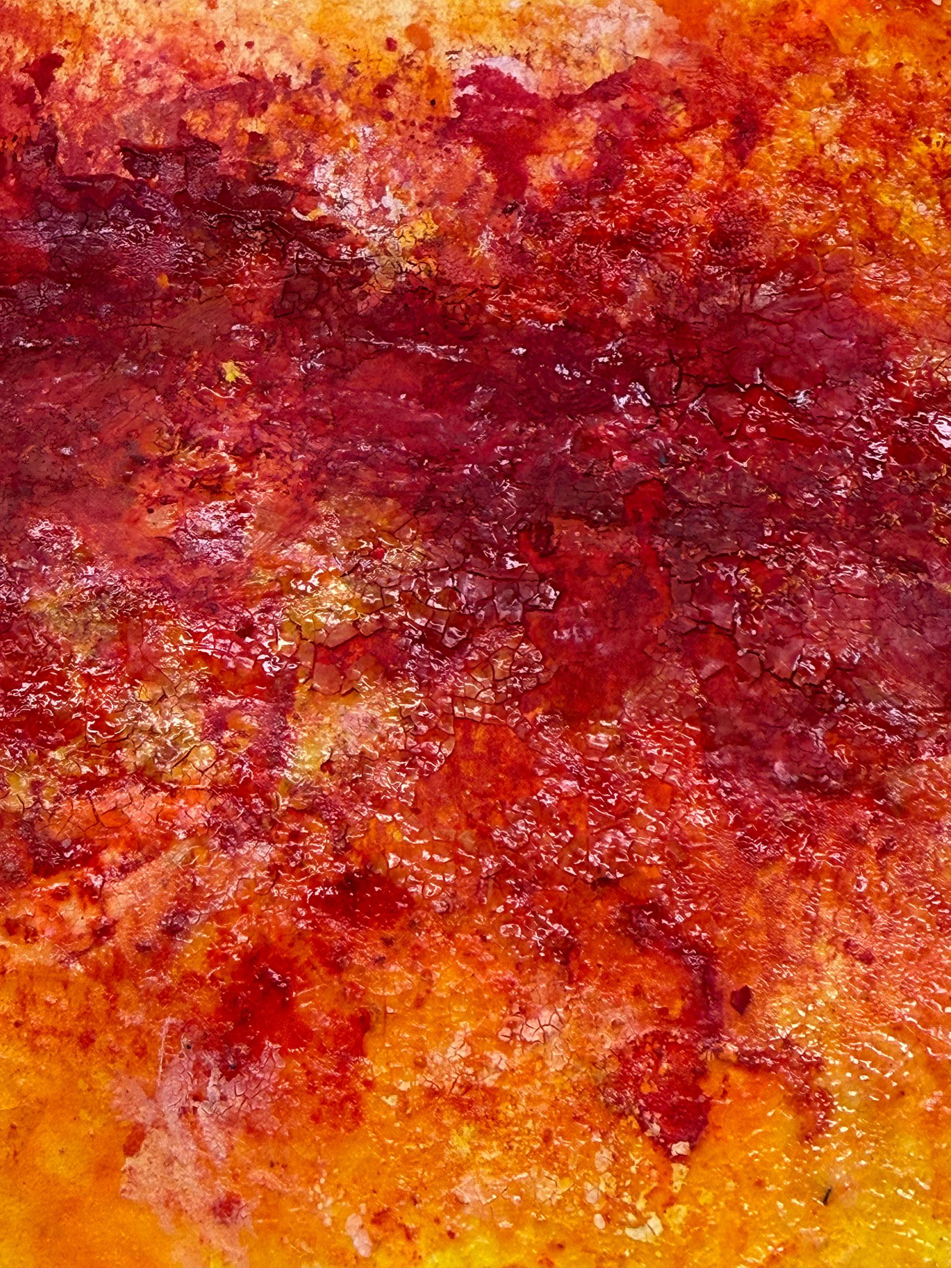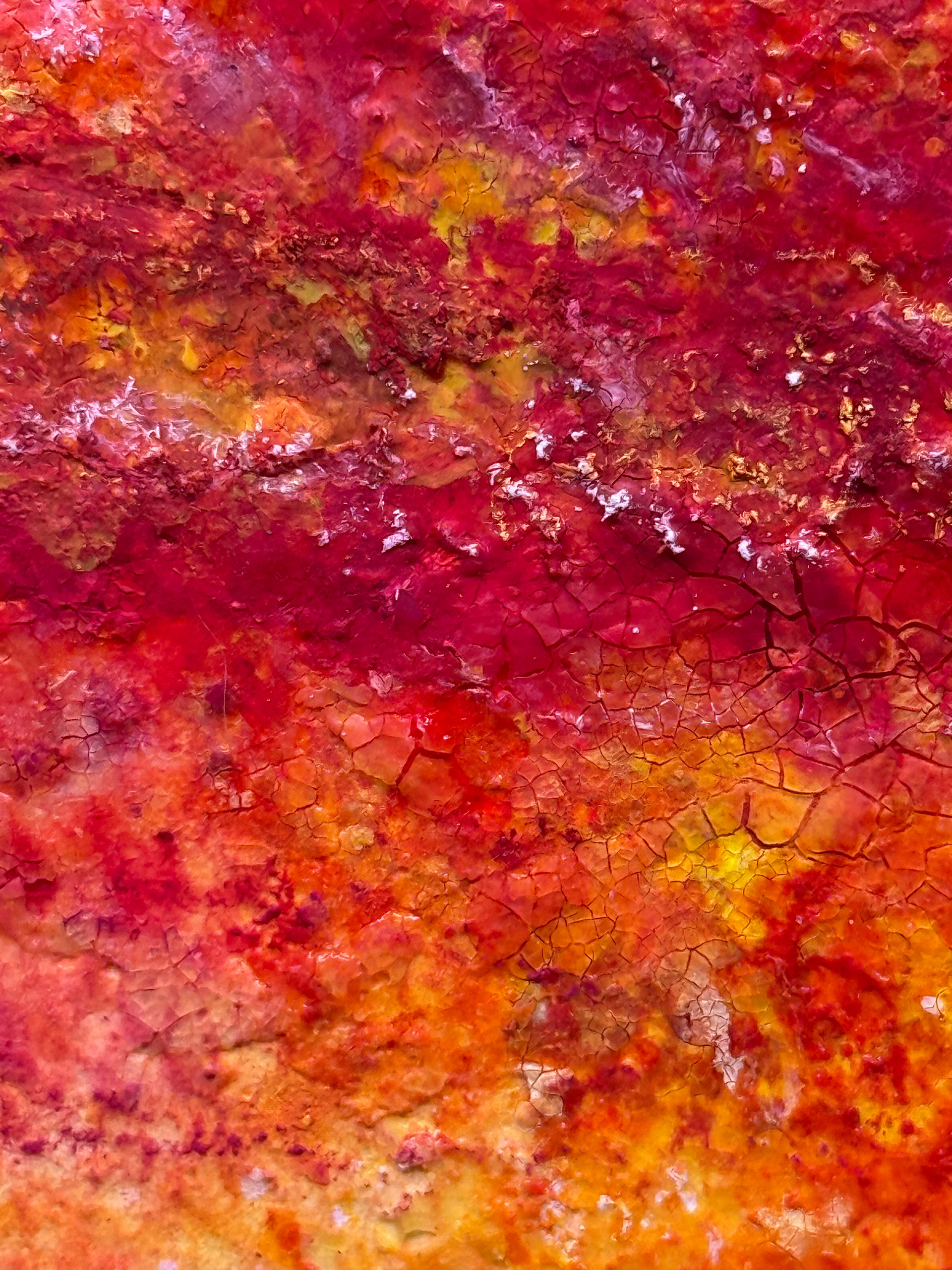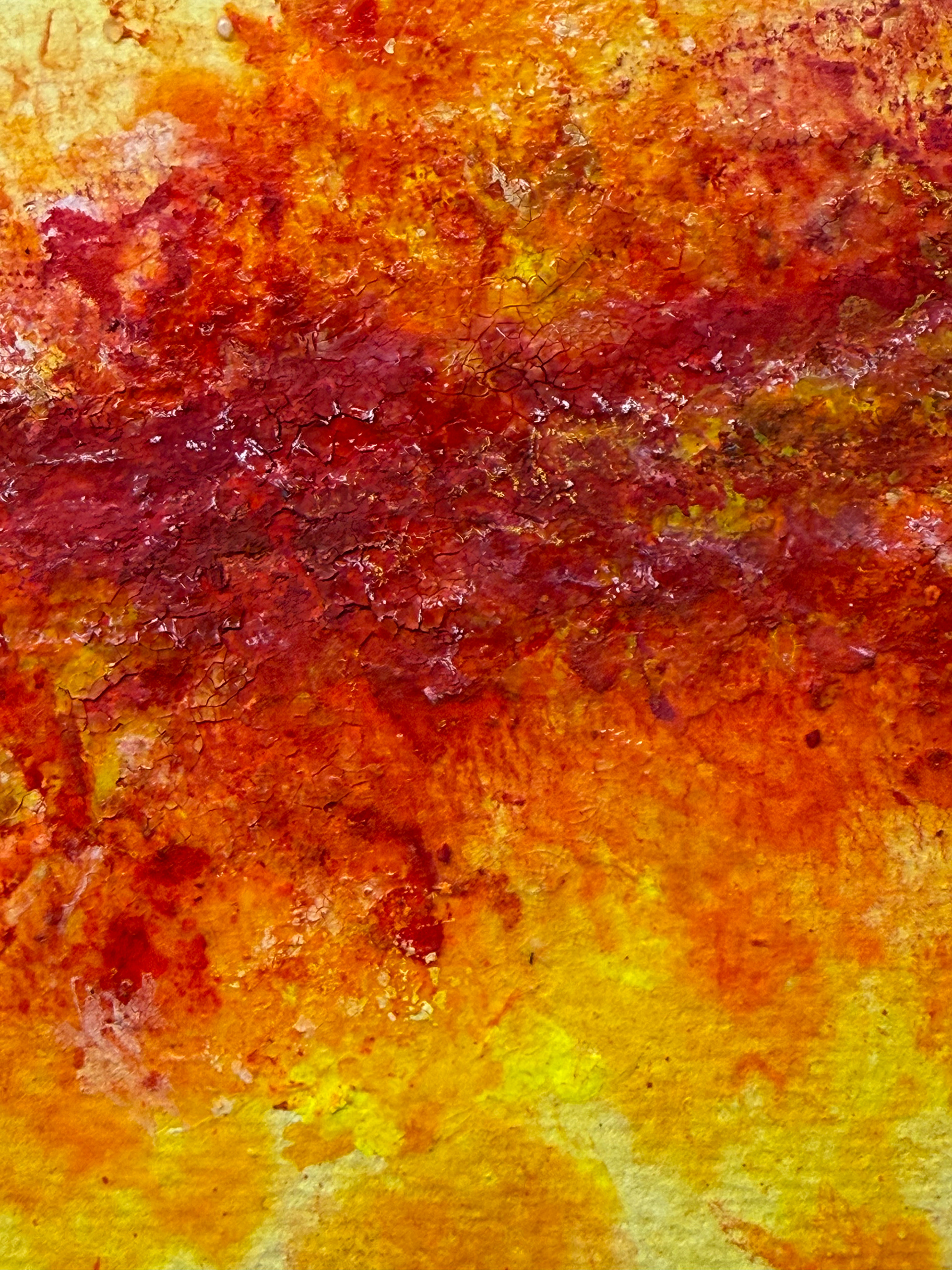 Abstrakcyjna kompozycja w intensywnej gamie czerwieni, oranżów i żółci, zdominowana przez horyzontalny pas nasyconej czerwieni w centralnej części obrazu. Zróżnicowana faktura powierzchni – od gęstych, spękanych struktur po transparentne, rozlane plamy – podkreśla procesualny charakter pracy i autonomię materii malarskiej. Kolorystyka przywołuje skojarzenia z żywiołowością, ciepłem i napięciem emocjonalnym, pozostawiając odbiorcy szerokie pole interpretacji.