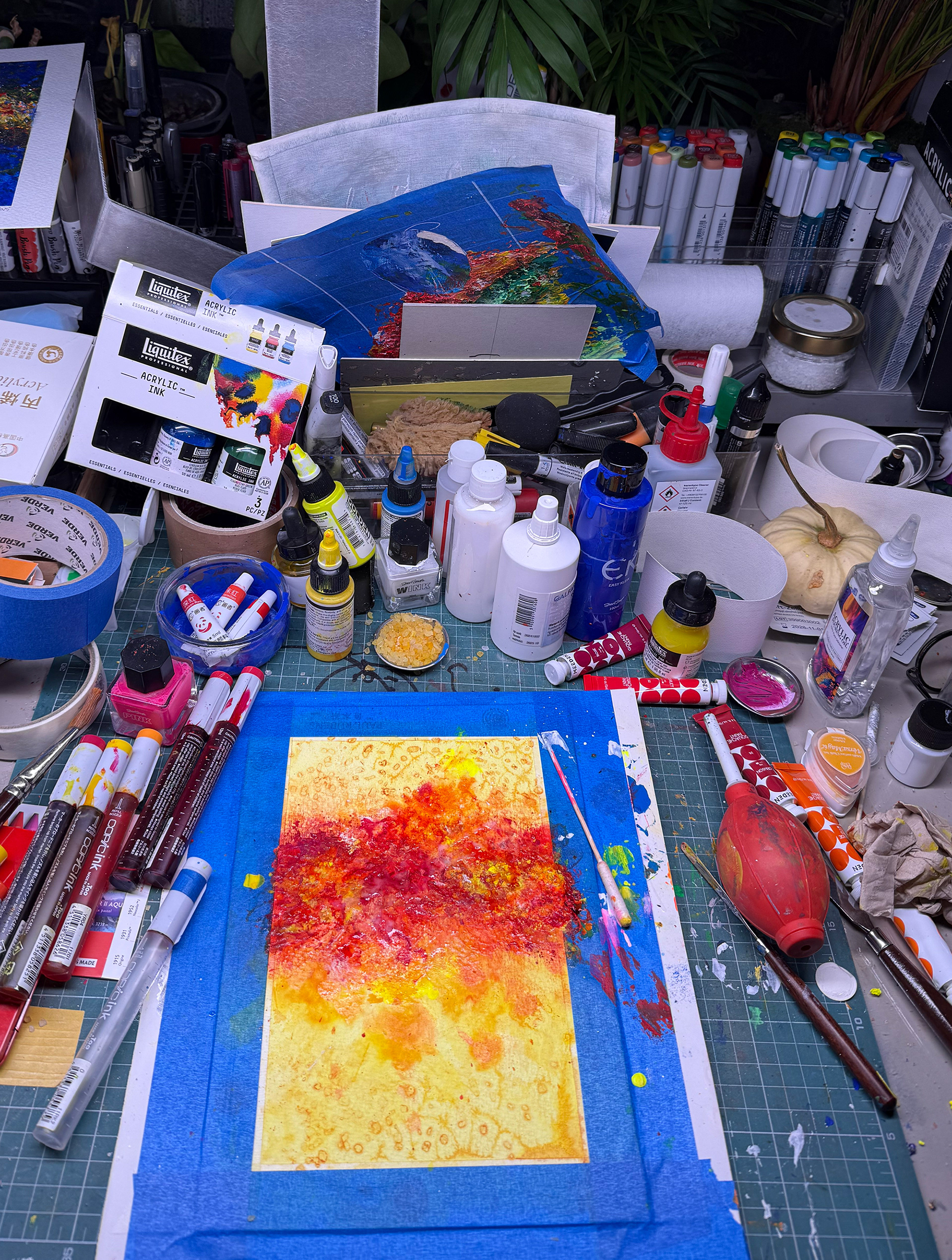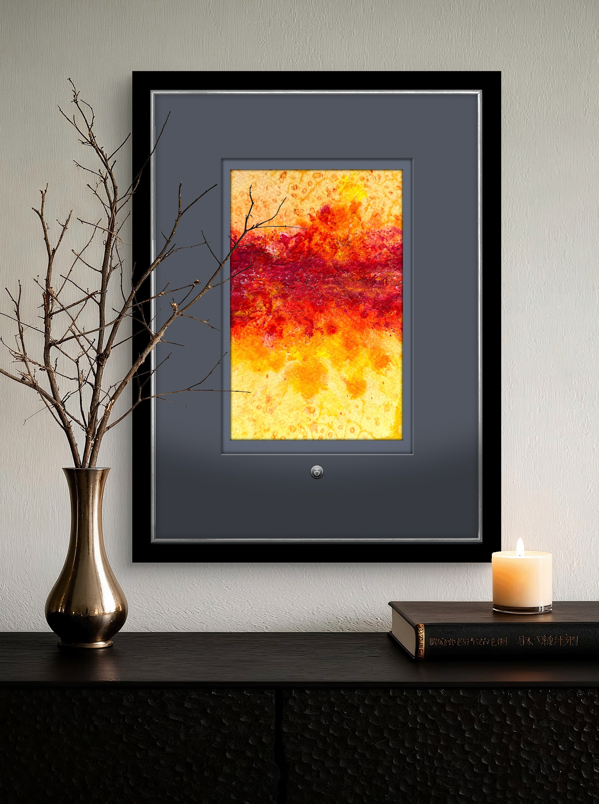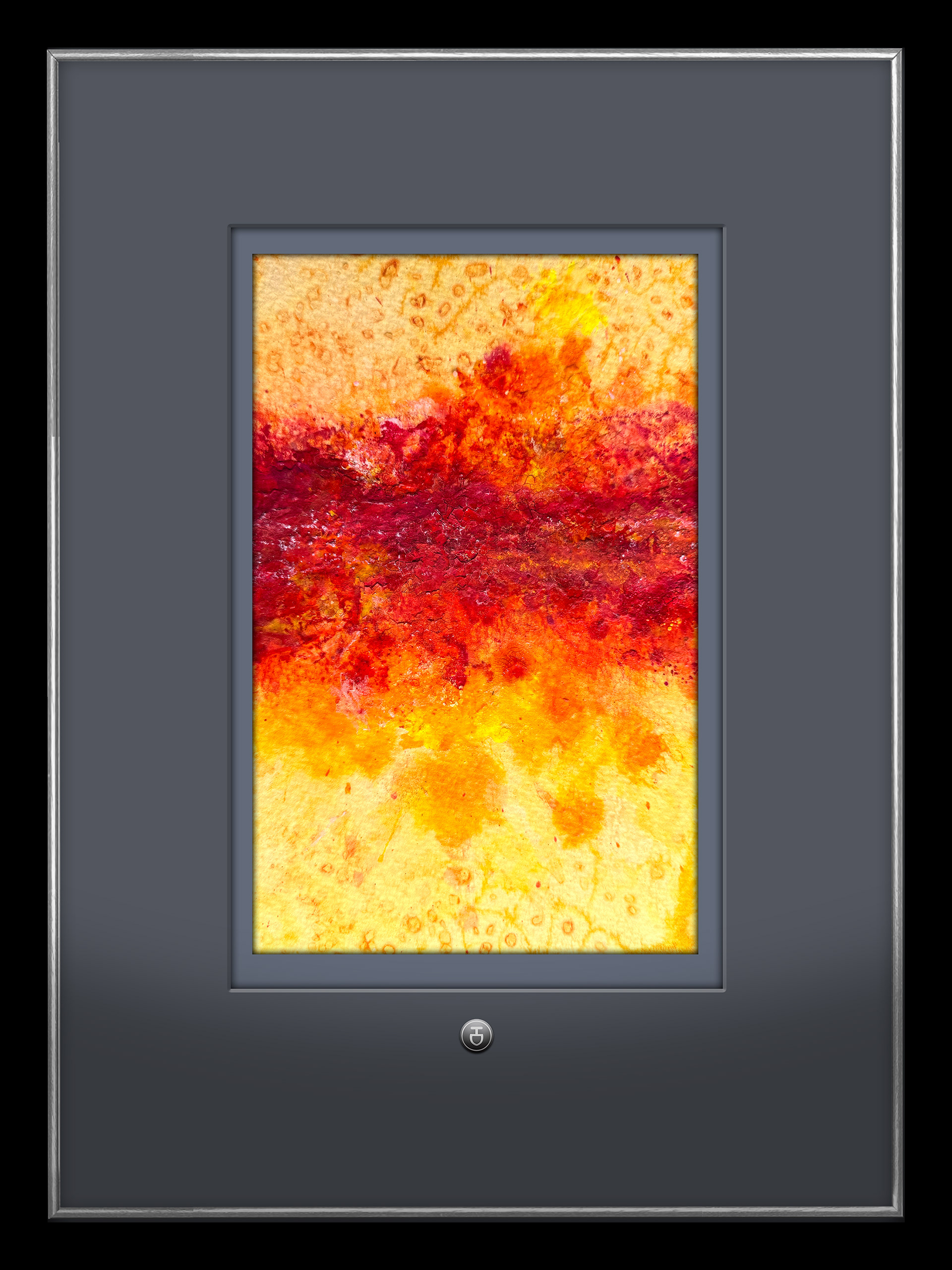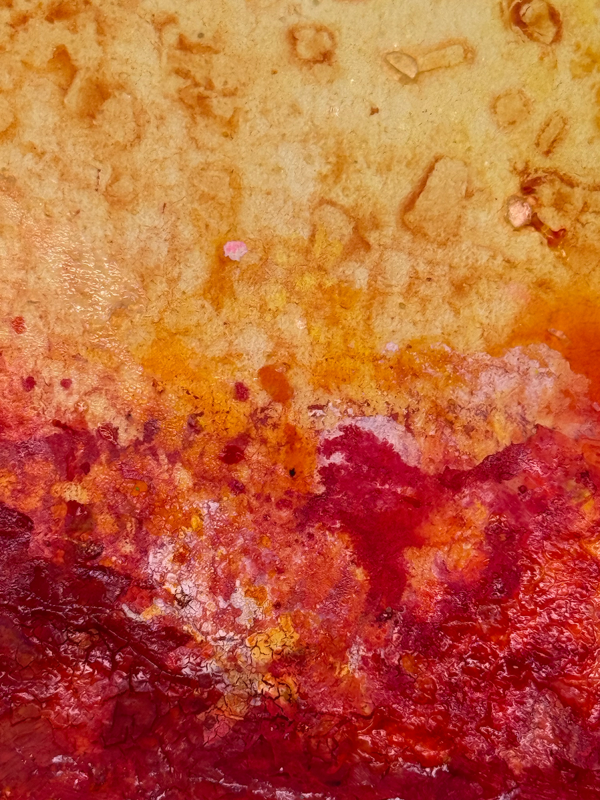Abstrakcyjna kompozycja w intensywnej gamie czerwieni, oranżów i żółci, zdominowana przez horyzontalny pas nasyconej czerwieni w centralnej części obrazu. Zróżnicowana faktura powierzchni – od gęstych, spękanych struktur po transparentne, rozlane plamy – podkreśla procesualny charakter pracy i autonomię materii malarskiej. Kolorystyka przywołuje skojarzenia z żywiołowością, ciepłem i napięciem emocjonalnym, pozostawiając odbiorcy szerokie pole interpretacji.